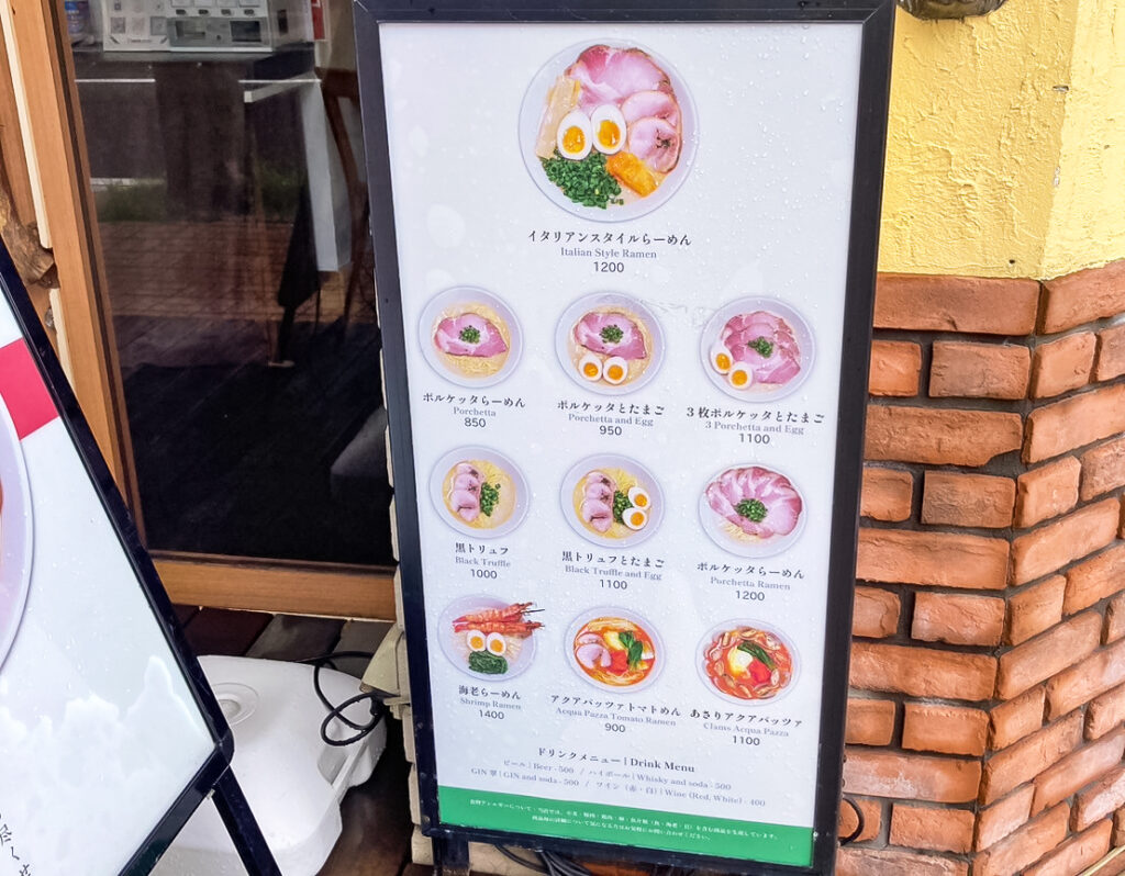イタリアンスタイルらーめん1200円、ボルケッタラーメン850円、黒トリュフラーメン1000円、アクアパッツァトマトめん900円など、普段目にしないメニューが並びます。