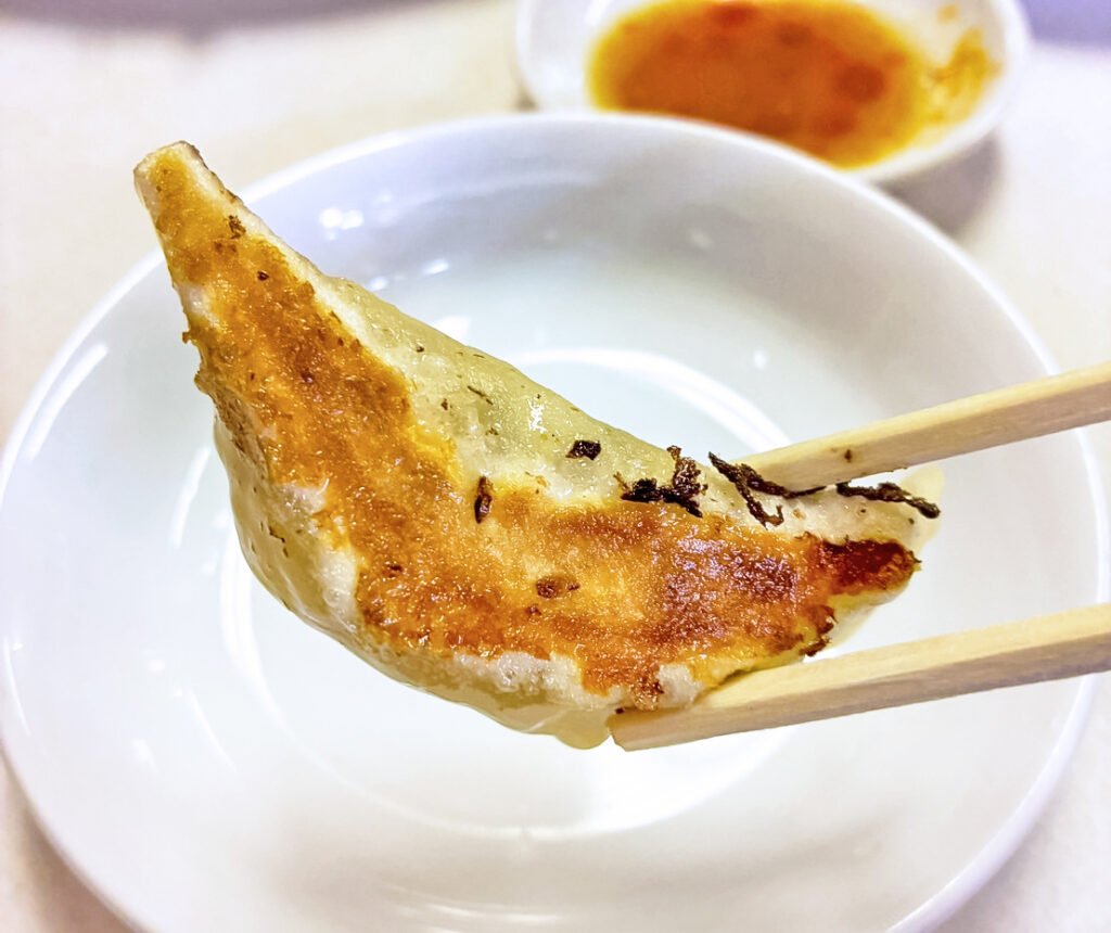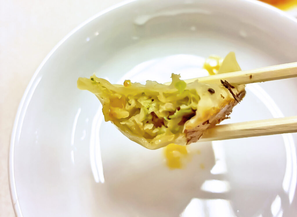 中には、ジューシーで旨みの強い肉と野菜が詰まった、香り高い一口爆弾。熱々を頬張ると、旨みと香りが一気に口いっぱいに広がります