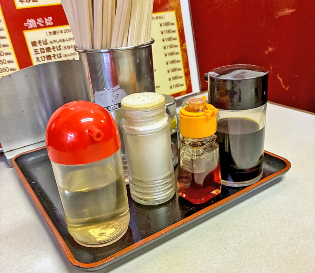 卓上には王道の調味料セット。ラー油のボトルは手にした時、少しぬるっとするところまでがセッティングの一部です。