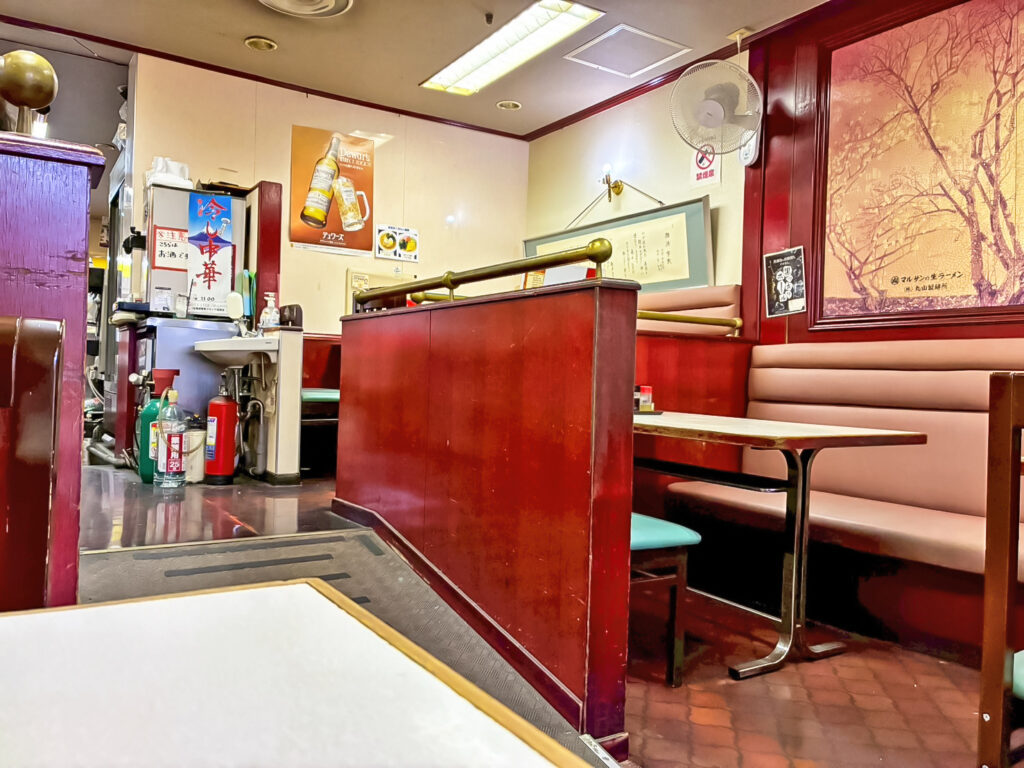 店内は、年季の入ったテーブル席が、創業当時の歴史を感じさせます。